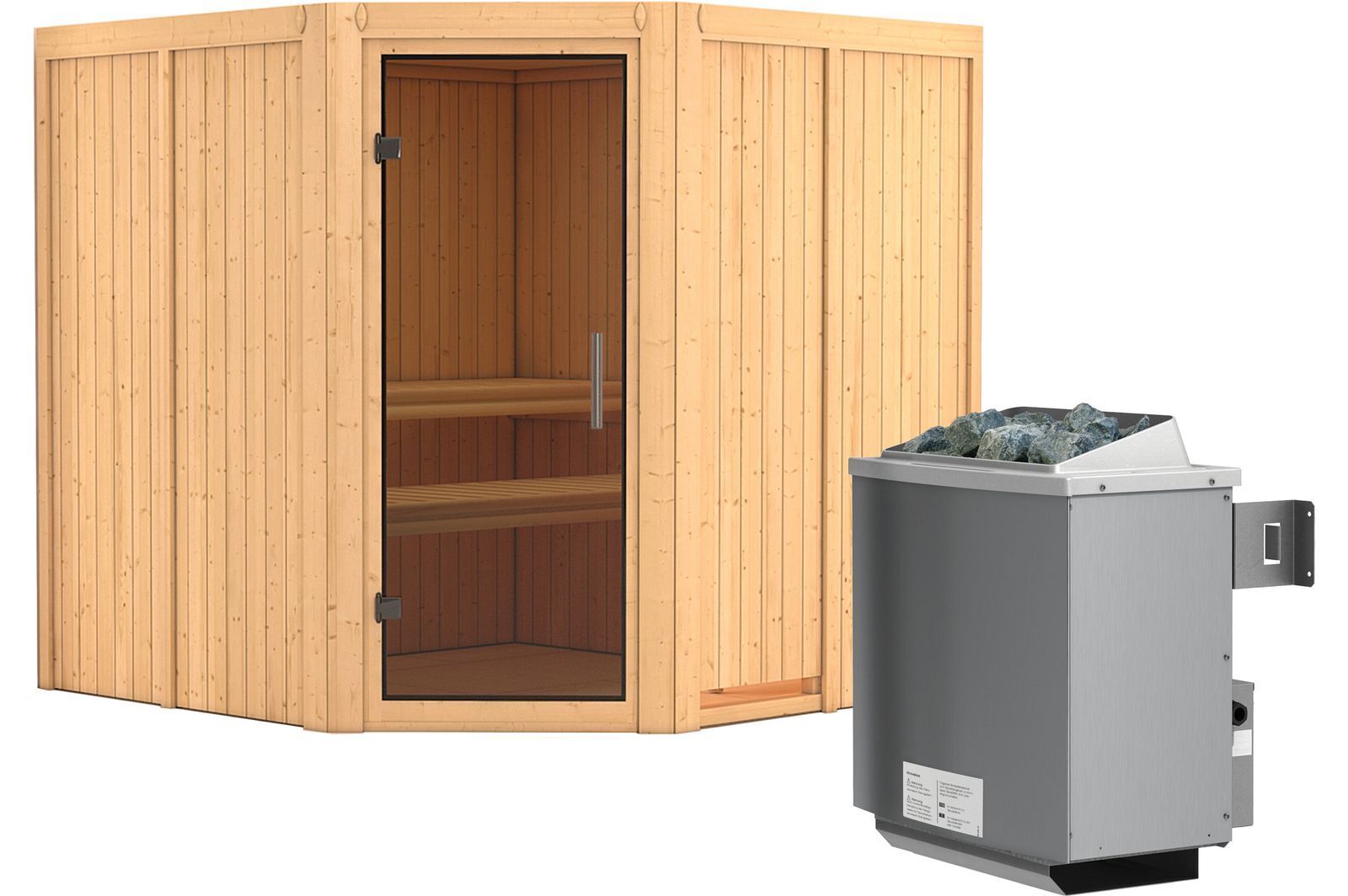 KARIBU Systemsauna Jarin, Fichtenholz 68mm, Eckeinstieg, ca. 3,4m²
