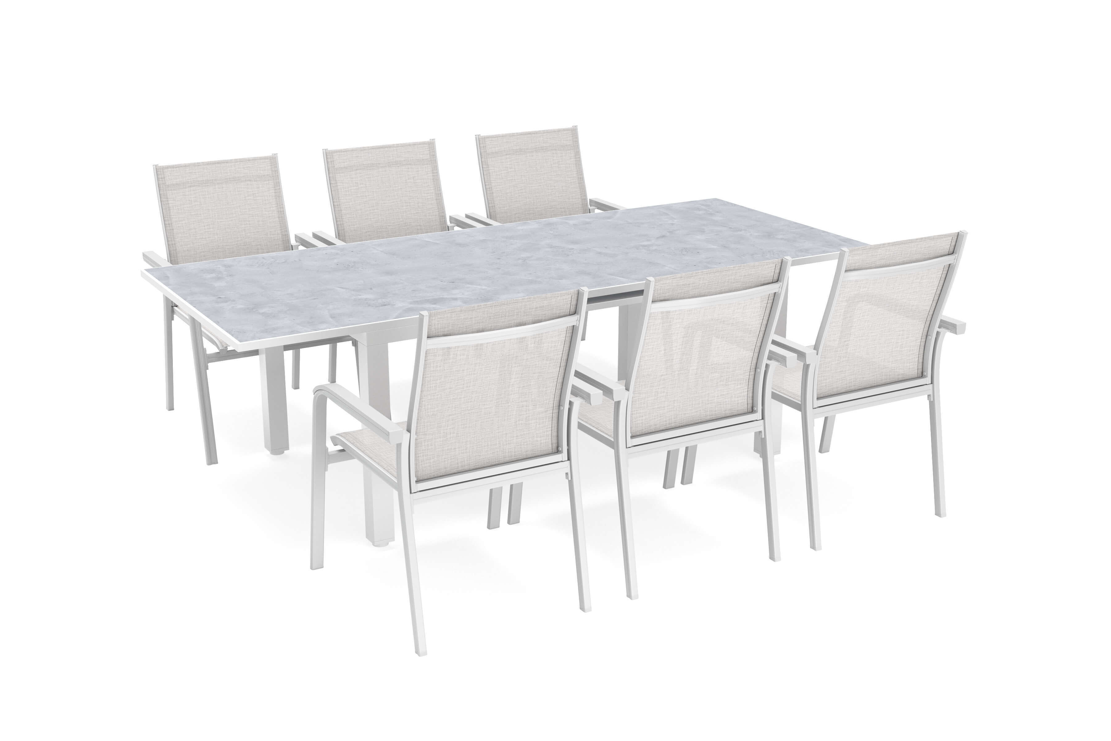KETTLER Garten-Essgruppe mit 6 Stapelsesseln, weiß matt/hellgrau, Alu/Outdoorgewebe, Ausziehtisch 180/240 x 100 cm Tisch